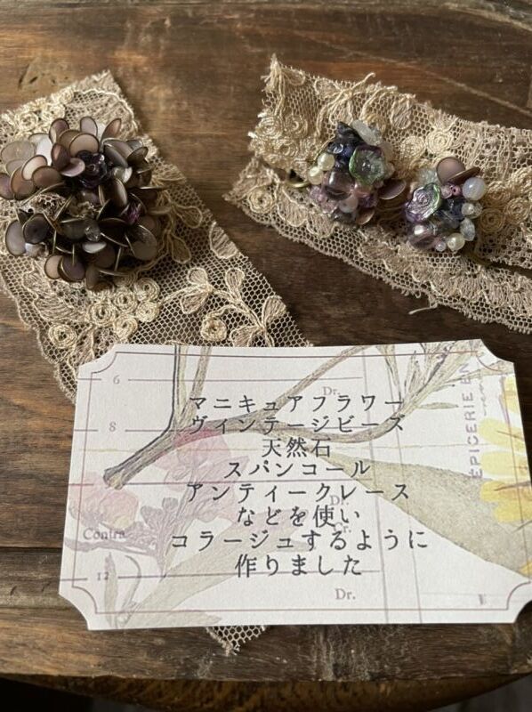 素材:マニキュアフラワー、ヴィンテージビーズ、スパンコール、アンティークレース、